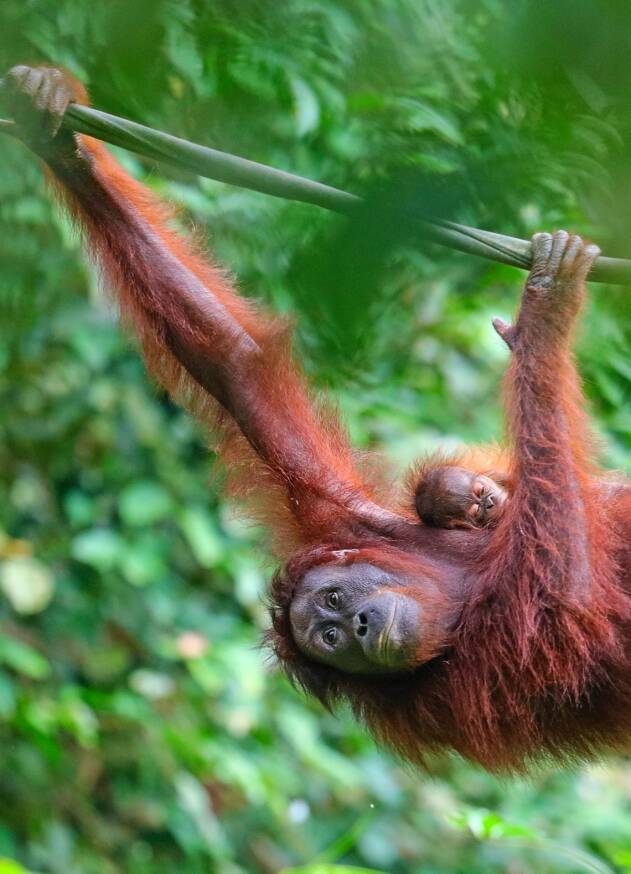 Orangutans are "gardeners" of the forest, playing a vital role in seed dispersal in their habitats. They live in tropical forests and prefer forest in river valleys and floodplains of their respective islands. Orangutans' extremely low reproductive rate makes their populations highly vulnerable. Females give birth to one infant at a time about every 3-5 years, so these species can take a long time to recover from population declines. With human pressure only increasing, orangutans face an increasing risk of extinction.