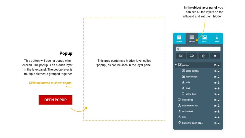 This button will open a popup when clicked. The popup is an hidden layer in the layerpanel. The popup-layer is multiple elements grouped together.