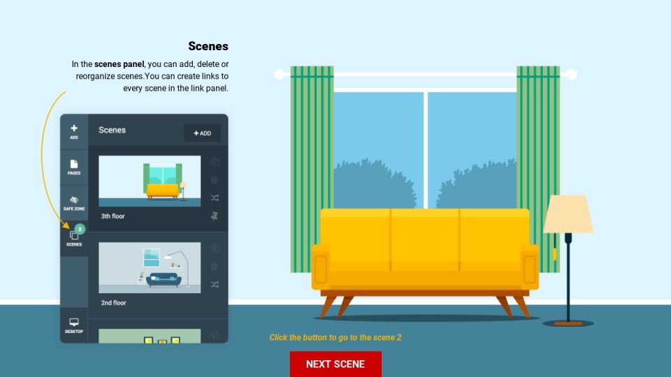 In the scenes panel, you can add, delete or reorganize scenes.You can create links to every scene in the link panel.